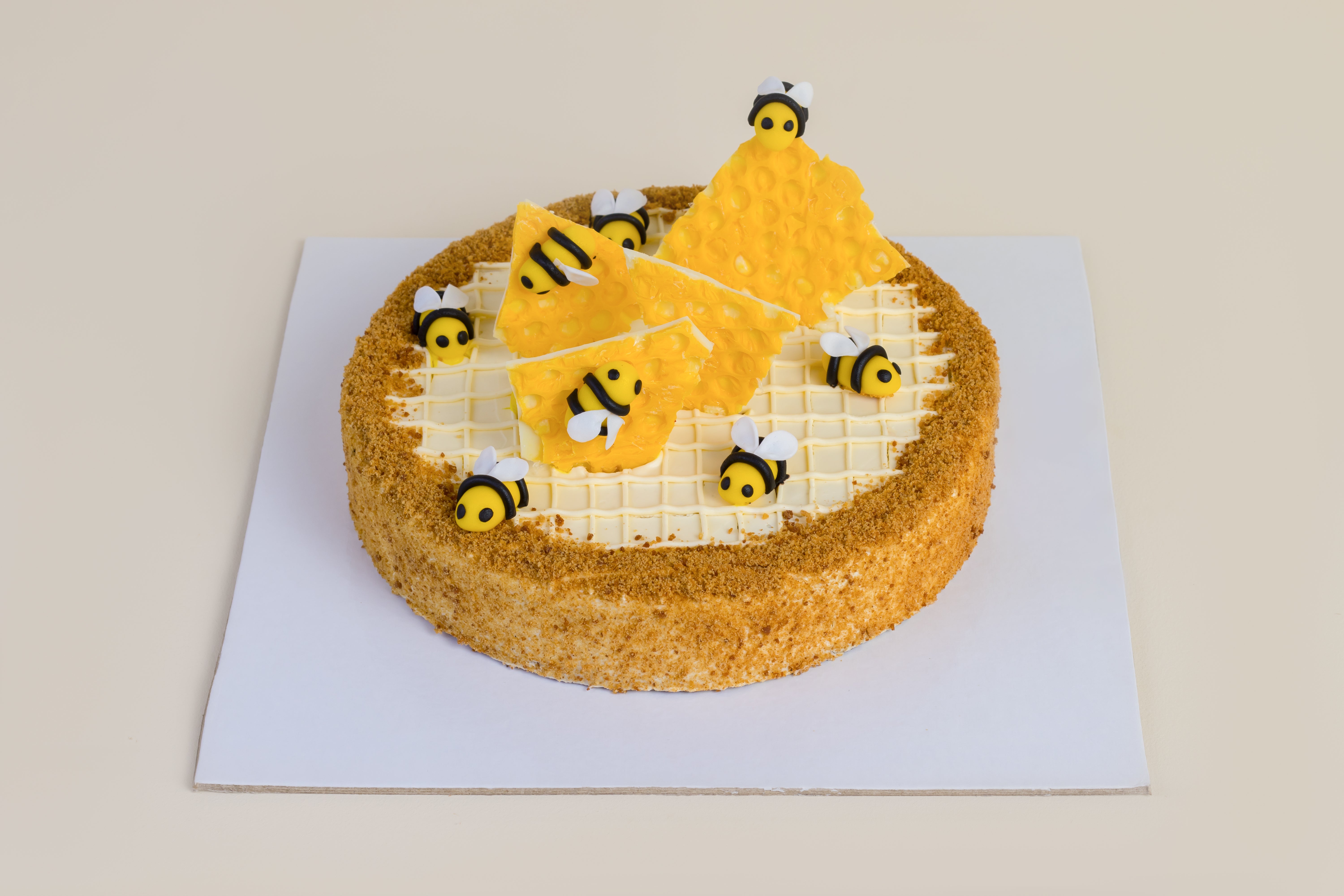 Un gâteau moelleux et riche au miel, confectionné avec du miel naturel, garni d'une crème onctueuse et décoré d'élégants motifs de nid d'abeille et d'abeilles. Le choix idéal pour les fêtes et les moments précieux.